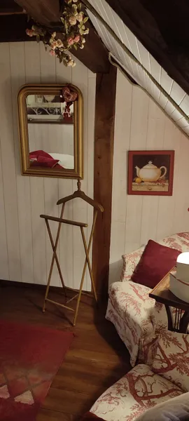 Notre chambre mansardée avec salle d’eau, wc privatif avec accès indépendant au jardin vous attend pour un séjour de repos ou de découverte du patrimoine local !